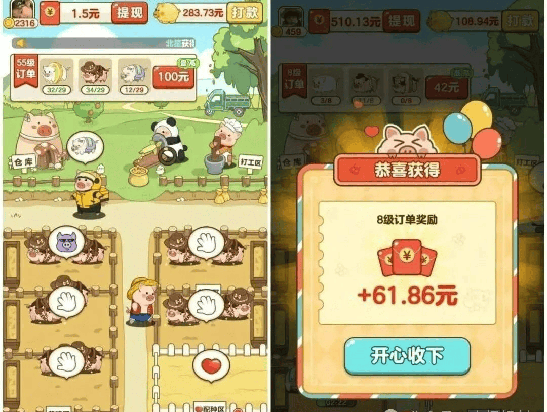 这是一款以养成模拟为核心的小游戏。玩家通过养猪、合成、卖猪等操作推进订单系统。
