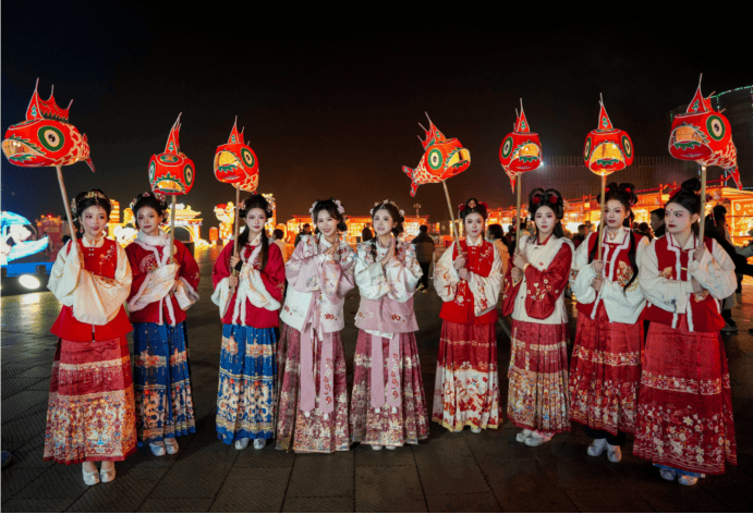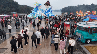 仙女湖景区精心打造的鱼灯巡游、NPC互动、财神送福等特色演艺轮番上演、精彩纷呈;投壶、猜灯谜、国风游艺等沉浸式体验项目老少皆宜、趣味十足。特色美食、文创市集人气高涨、热闹非凡,市民游客漫步灯海、拍照打卡,处处洋溢着喜庆热闹的节日氛围。