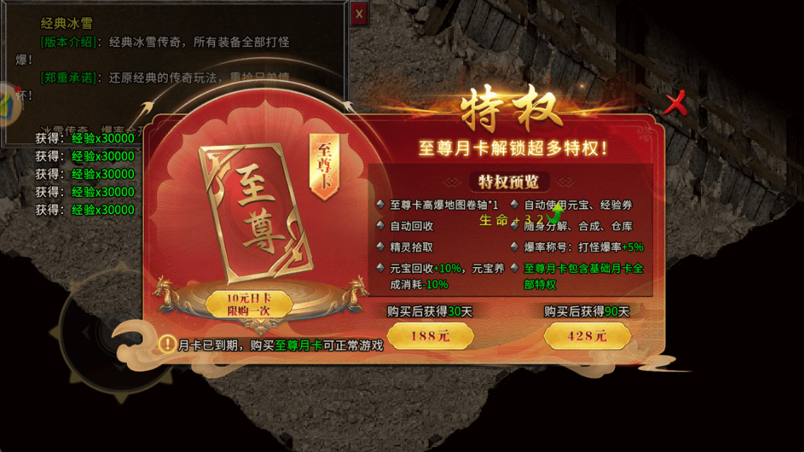 在付费模式上,《冰雪传奇重制版》采用了极为透明的月卡制度。玩家只需购买一张月卡,即可享受游戏内的所有基础服务,包括但不限于经验加成、装备掉落率提升等,无需再为额外的付费项目而烦恼。这种设定不仅大大降低了玩家的经济负担,更重要的是,它维护了游戏的公平性,确保了所有玩家在同一起跑线上竞争,真正实现了“技术决定高度,努力决定收获”。
