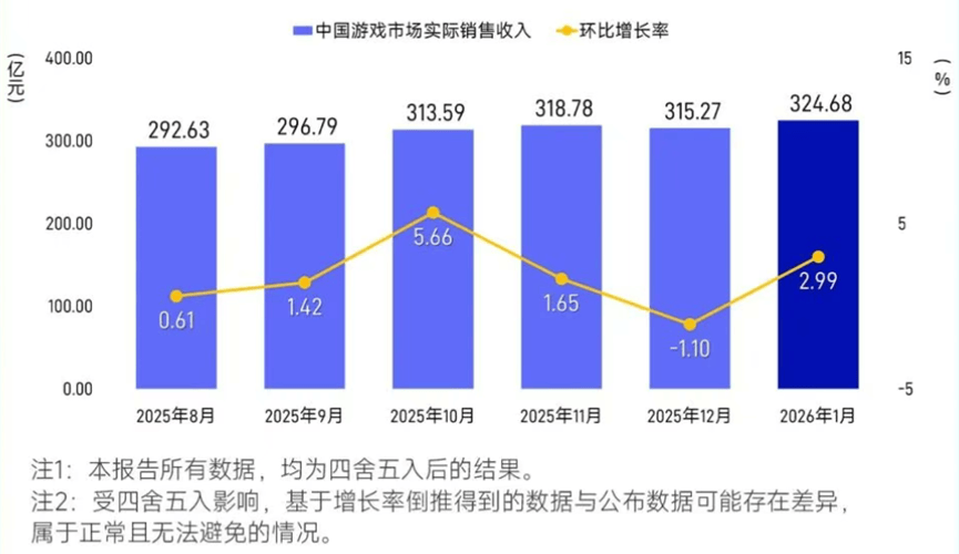 2月13日,伽马数据发布了《2026年1月游戏产业报告》。数据显示,中国国内游戏市场实际销售收入为324.68亿元,环比增长2.99%,同比增长4.47%。其中,客户端游戏市场表现尤为突出,实际销售收入达82.36亿元,环比增长7.77%,同比大幅增长23.46%,增速显著高于整体市场水平;移动游戏市场实际销售收入为226.21亿元,环比增长1.8%,同比下降1.52%。