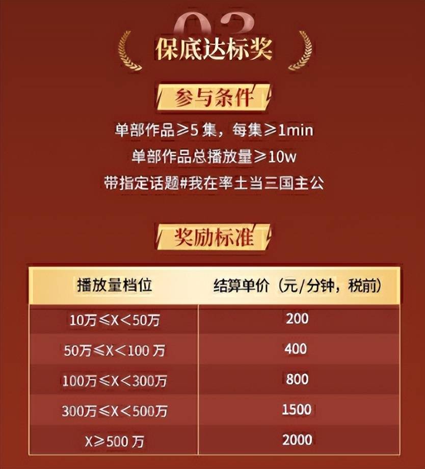 奖金设置也相当丰厚:播放量排行第一名可获12万元,第二名7万元,第三名5万元;还设有最佳人气奖,点赞数最高的3名创作者各获1.5万元。更贴心的是,大赛设置了保底达标奖——只要播放量达到10万以上,就能按分钟数获得200元起的保底收益,播放量越高,单分钟收益越高,最高可达2000元、分钟。而且保底奖励可叠加,排行榜与人气奖择高发放。