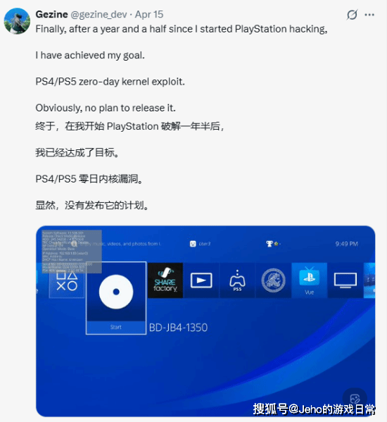 4月15日,韩国PS破解圈的老熟人Gezine,在社交平台上扔出了一颗重磅炸弹。他明确表示,自己已经同时拿下了PS4和PS5的系统内核,还找到了一个索尼完全不知情的零日漏洞——简单说就是,索尼连漏洞在哪都不知道,更别提修补了。圈内人都清楚,能摸到主机系统内核,就相当于拿到了PS5的“”。